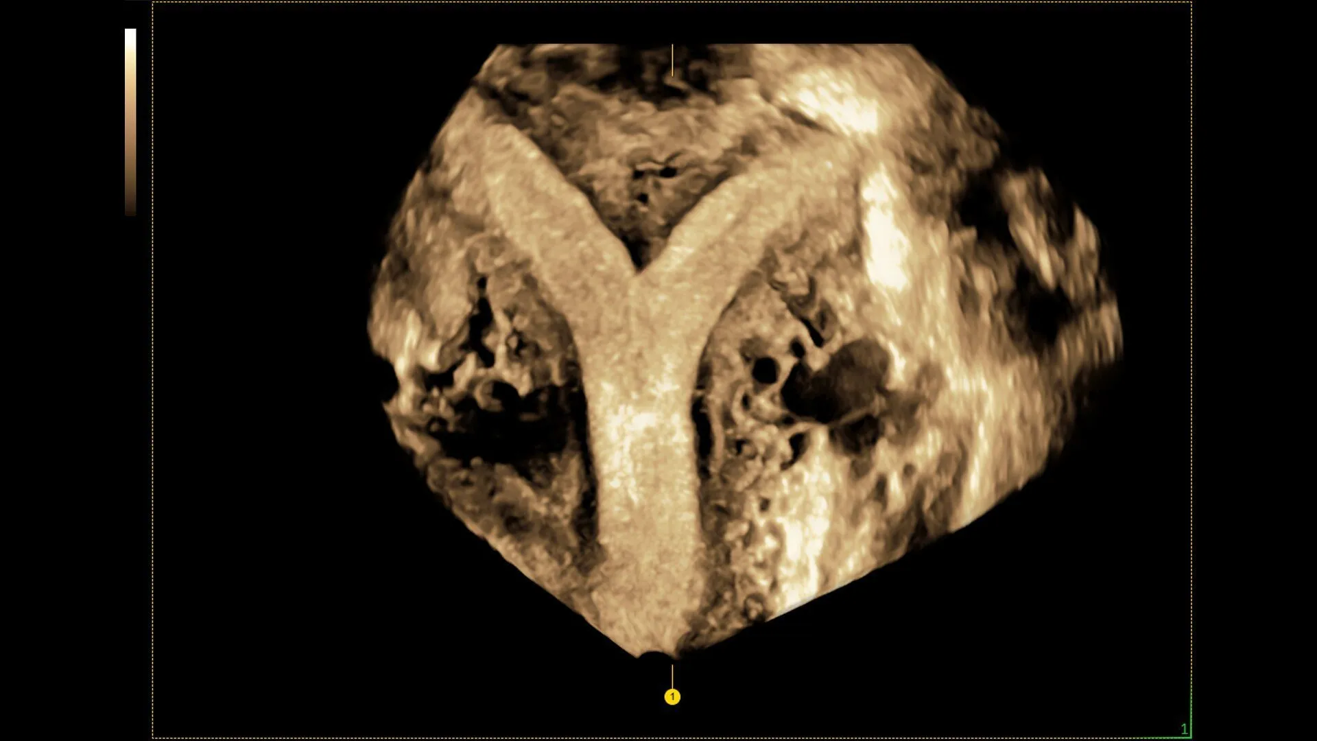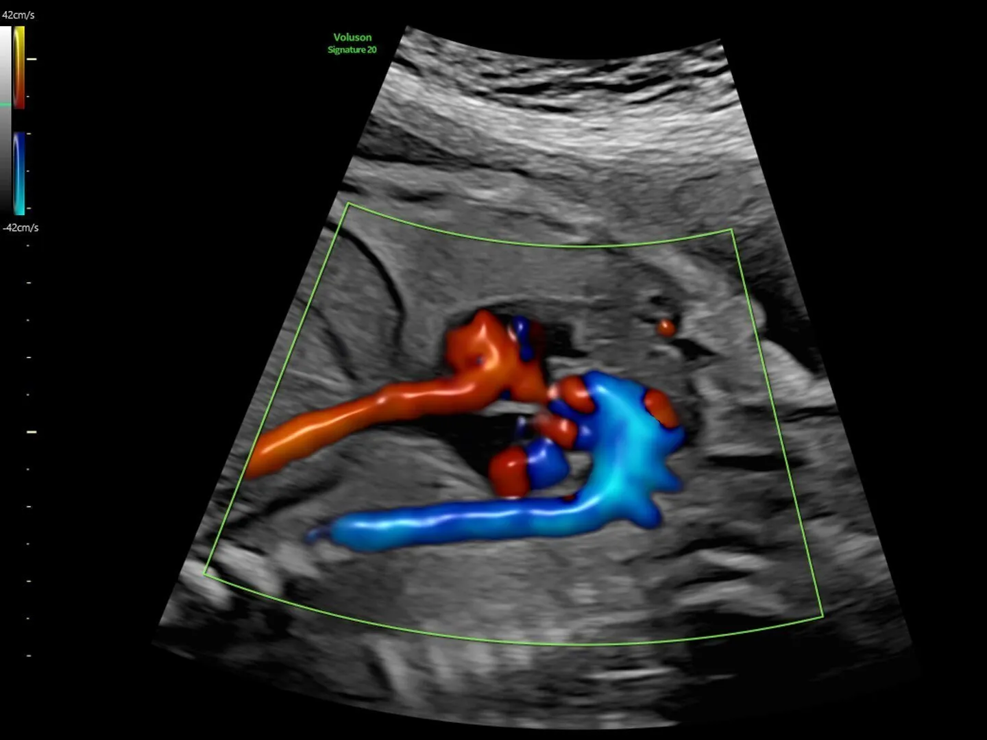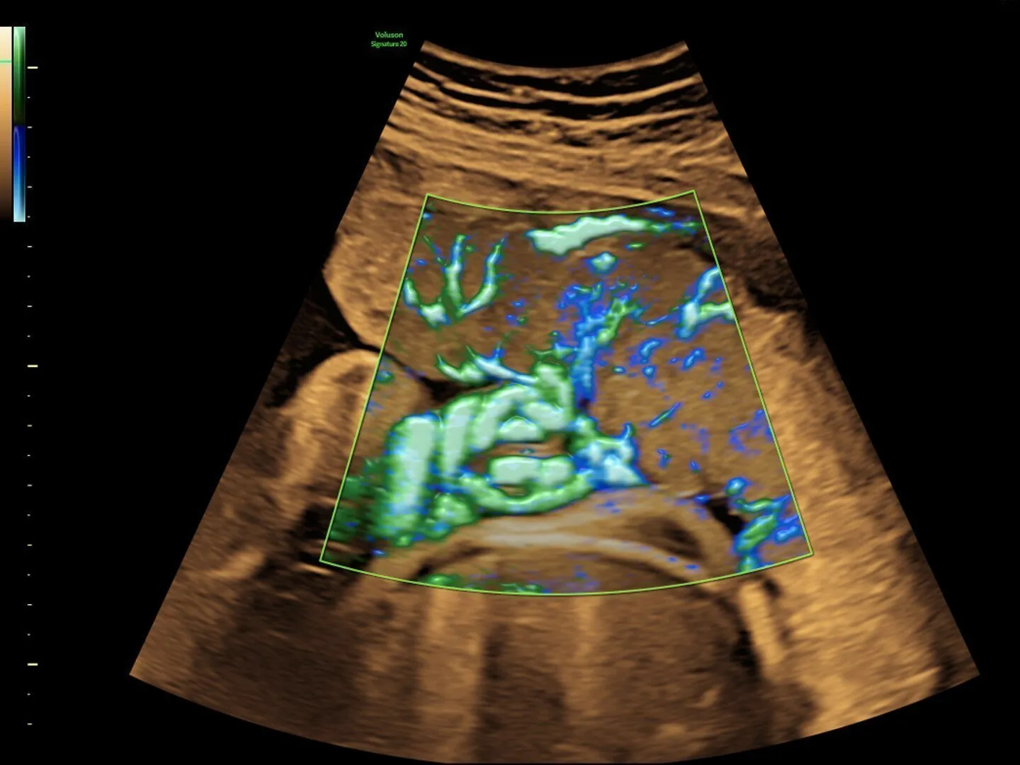 Цветная допплерография нового уровня, обеспечивающая невероятную чувствительность простой и быстрой визуализации схожим с трехмерным режимом кровотока, как на этом изображении сердца плода на 27-й неделе.